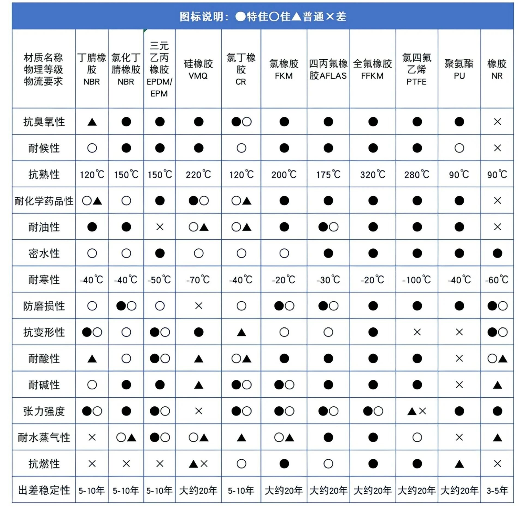 综合性能:EPDM(耐候)或氢化丁腈橡胶(HNBR,耐油+耐温)。