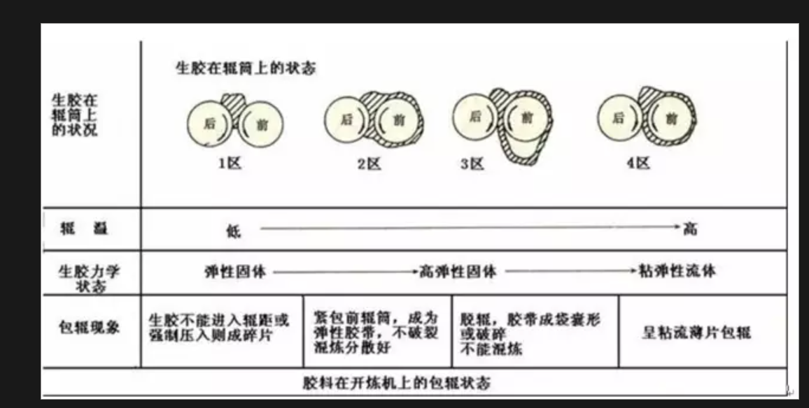 一、包辊不饱和橡胶在开炼机上加工时,改变辊筒温度会出现四种不同的包辊状态。温度较低,胶料较硬,弹性高,橡胶主要停留在堆积胶处滑动,延迟生产过程。温度适宜,橡胶能正常包于辊筒上,既有塑性流动又有适当高的弹性变形,有利于混炼操作。随着温度的提高,流动性增加,分子间力减小,强度降低,胶片不能紧包在辊筒上,出现脱辊或破裂现象。橡胶在更高的温度下呈粘弹性流体包于辊筒,并产生塑性流动。